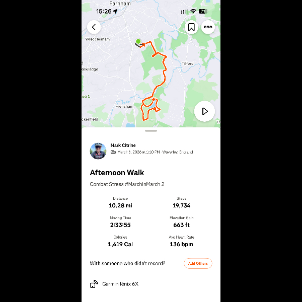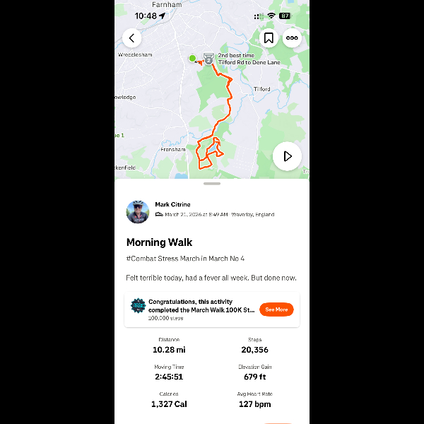 I am doing this clearly to raise some funds for a great charity that helps veterans, being a veteran myself it will help me get back into some routine of phys, putting some weight on my back (20kg) and getting out in the fresh air.Support my March in March